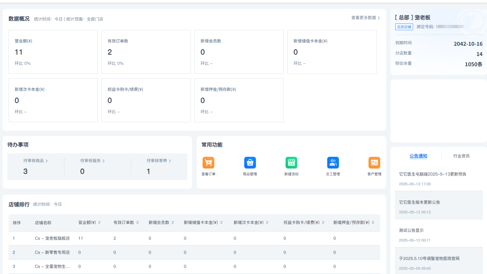 支持查看连锁体系下各门店数据概况及排行,支持快捷跳转常用功能及待办事项