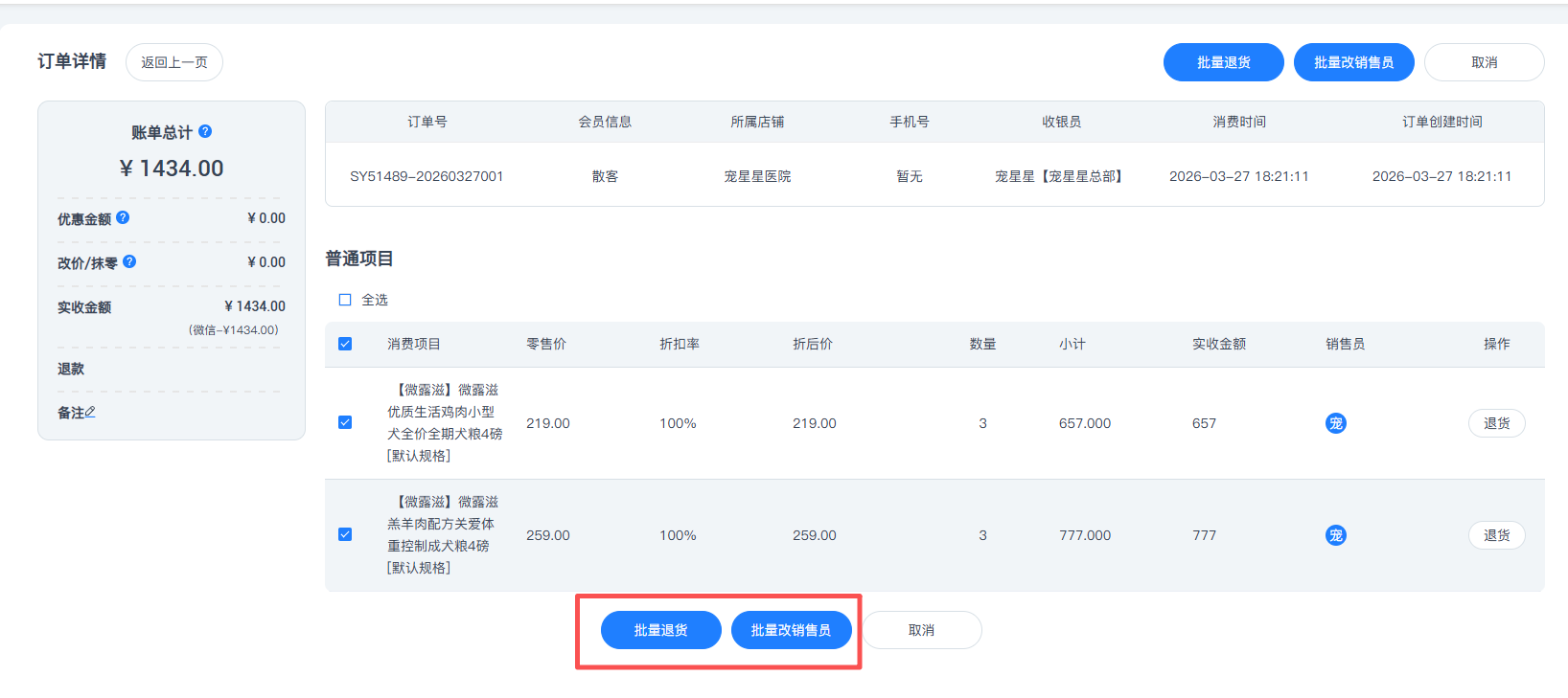 6. 订单详情新增支持批量【退货】及修改【销售员】