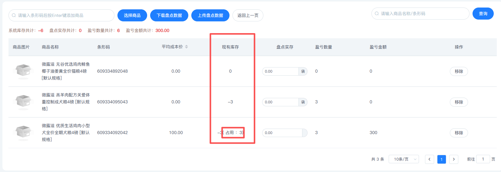 2. 盘点管理优化,盘点列表原系统库存更名为现有库存,且当库存被占用时会同时展示现有库存数及被占用的库存数