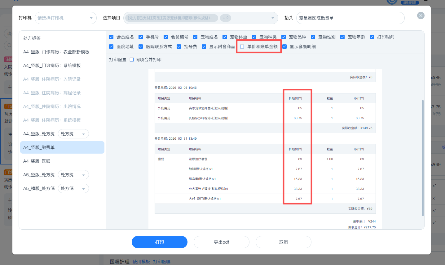 11. 缴费单打印新增【单价和账单金额】和【显示套餐明细】配置项,不勾选【单价和账单金额】时,缴费单打印将不打印项目单价,仅展示折后价及实收金额