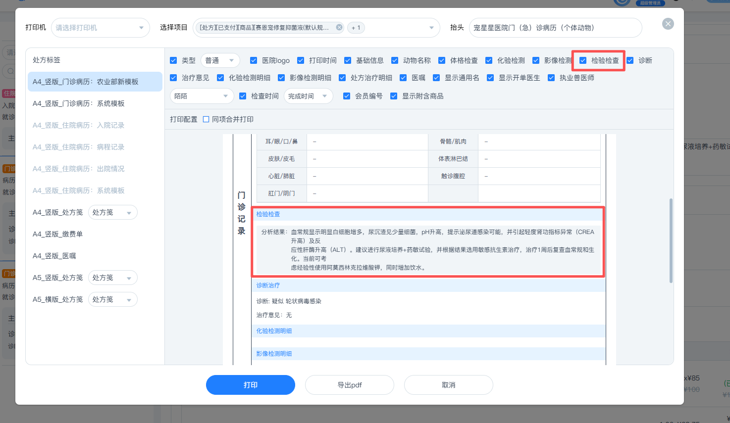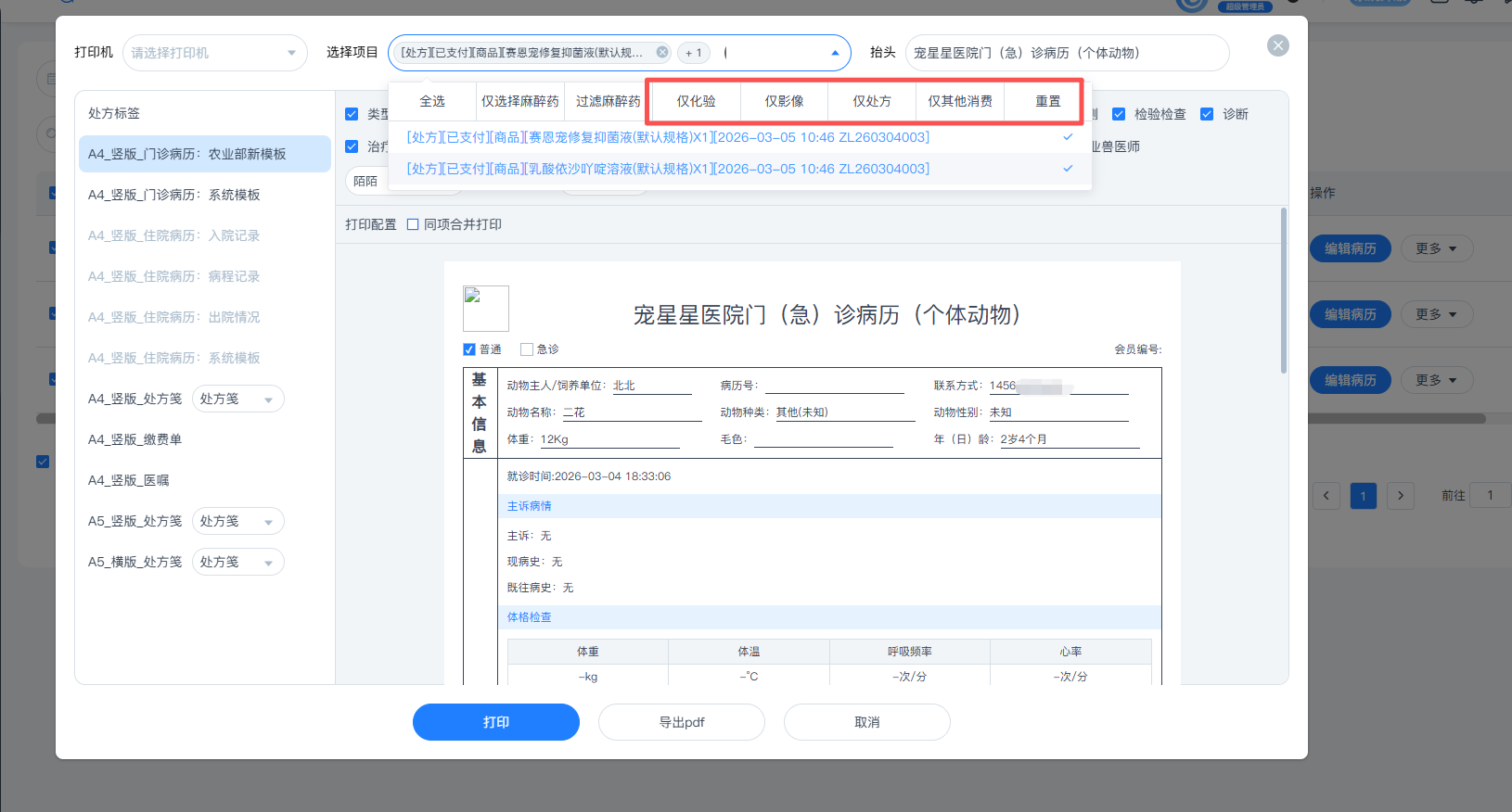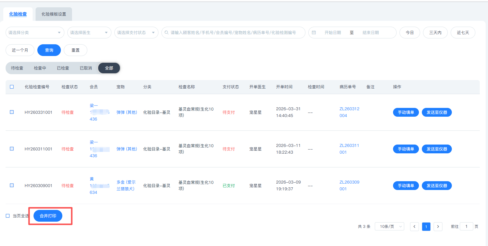 12. 化验管理新增支持合并打印相同宠物的化验检查单