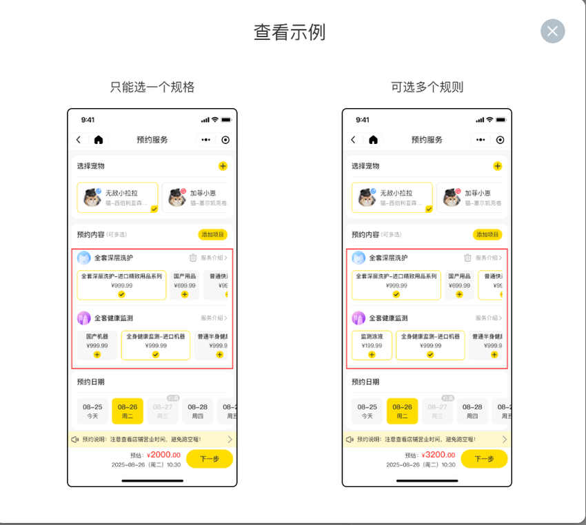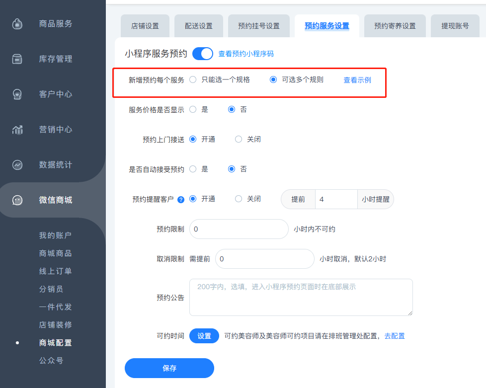 1.小程序预约服务支持配置【新增预约时每个服务支持单选规格或多选规格】