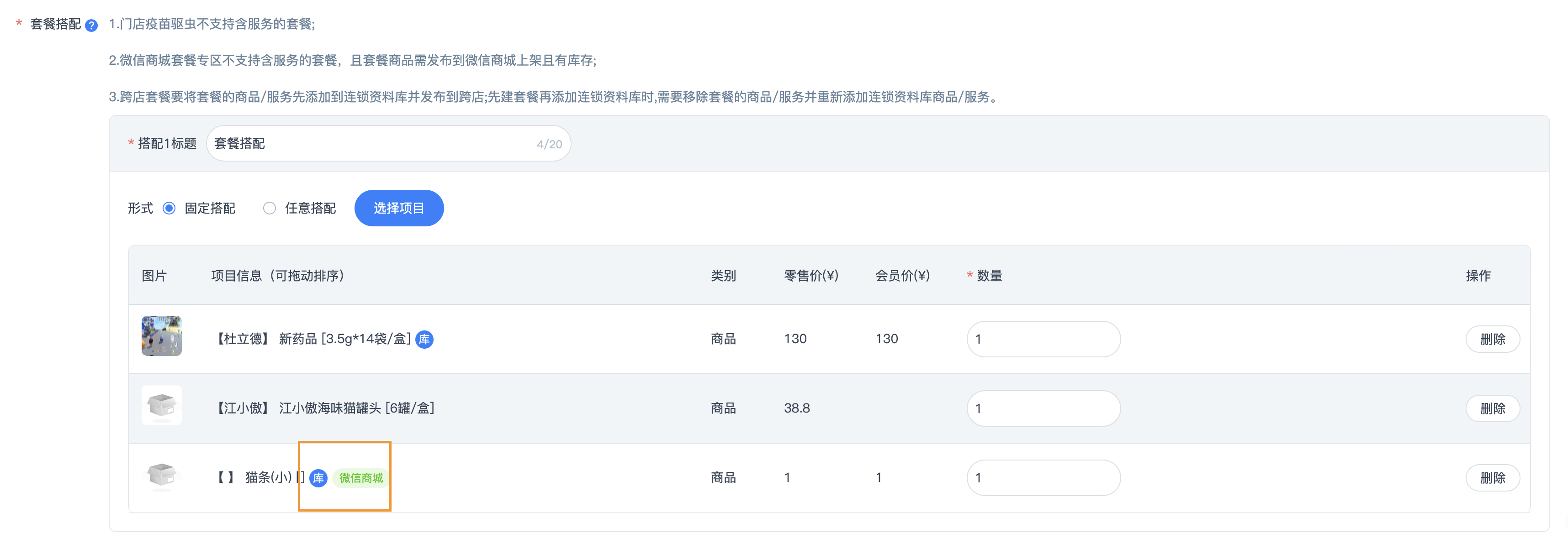 3.创建/编辑套餐设置项目时,新增展示项目【是否来源于资料库】和【是否发布到微信商城】标识