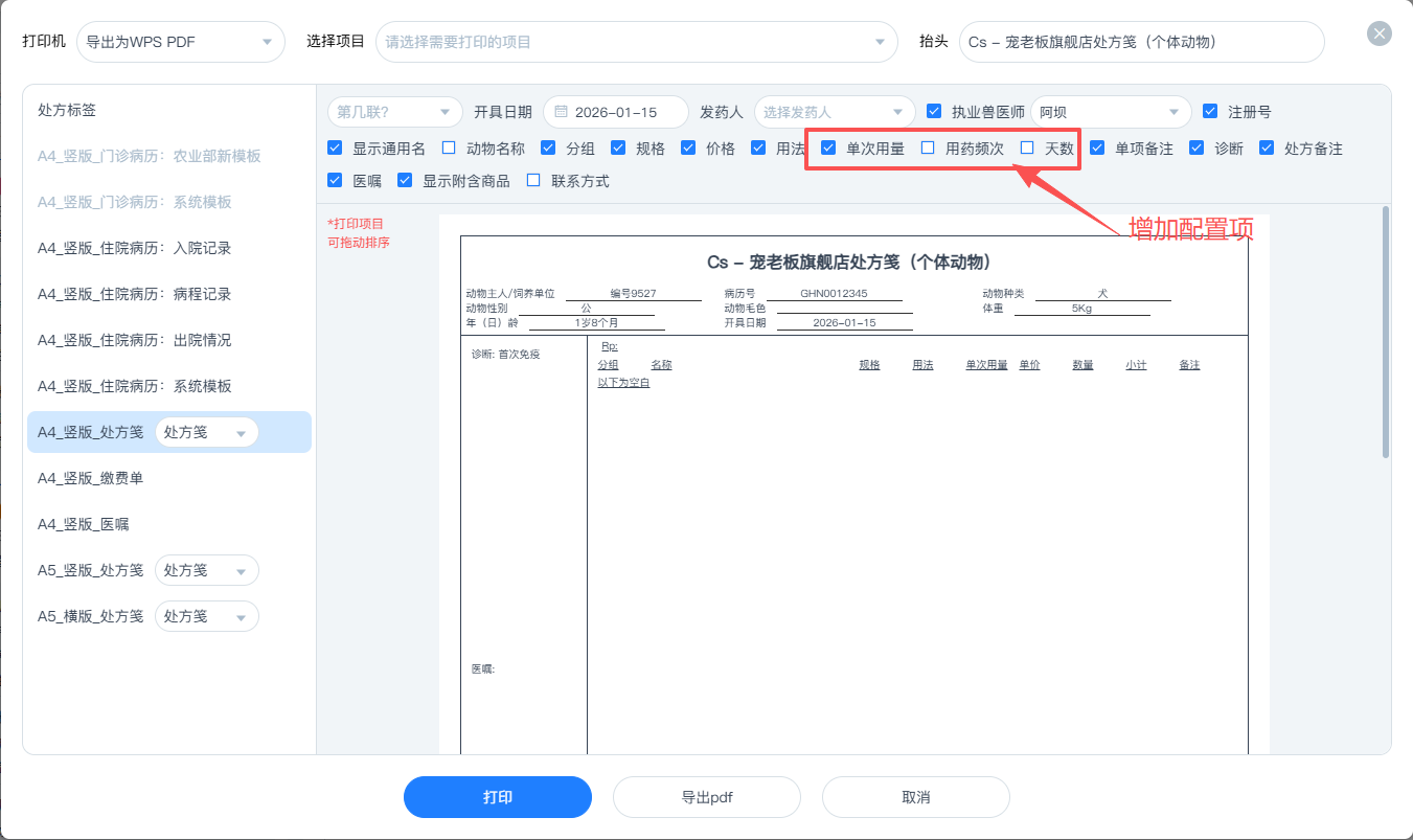 优化处方笺模板与农业部标准模板一致,并支持配置单次用量、用药频次、天数。