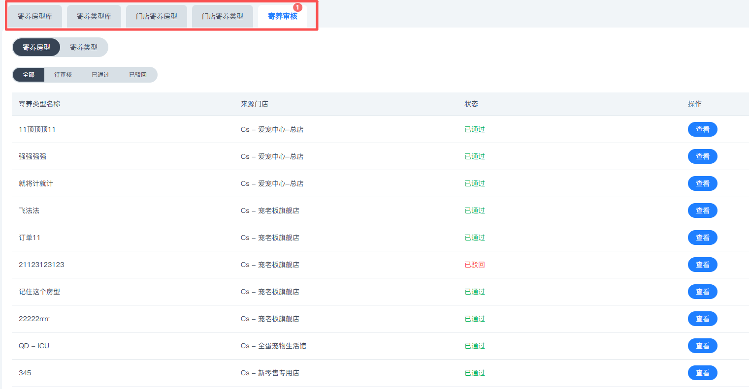 总部可查看分店酒店式寄养及普通寄养模式下的各个房间类型,同时支持总部审核门店单独创建的寄养房型及类型
