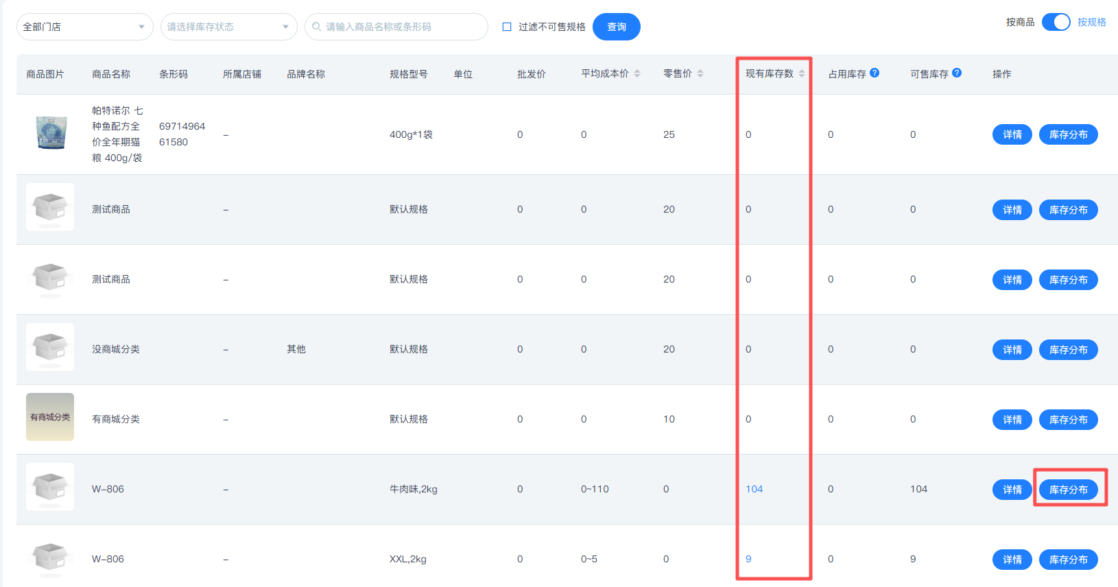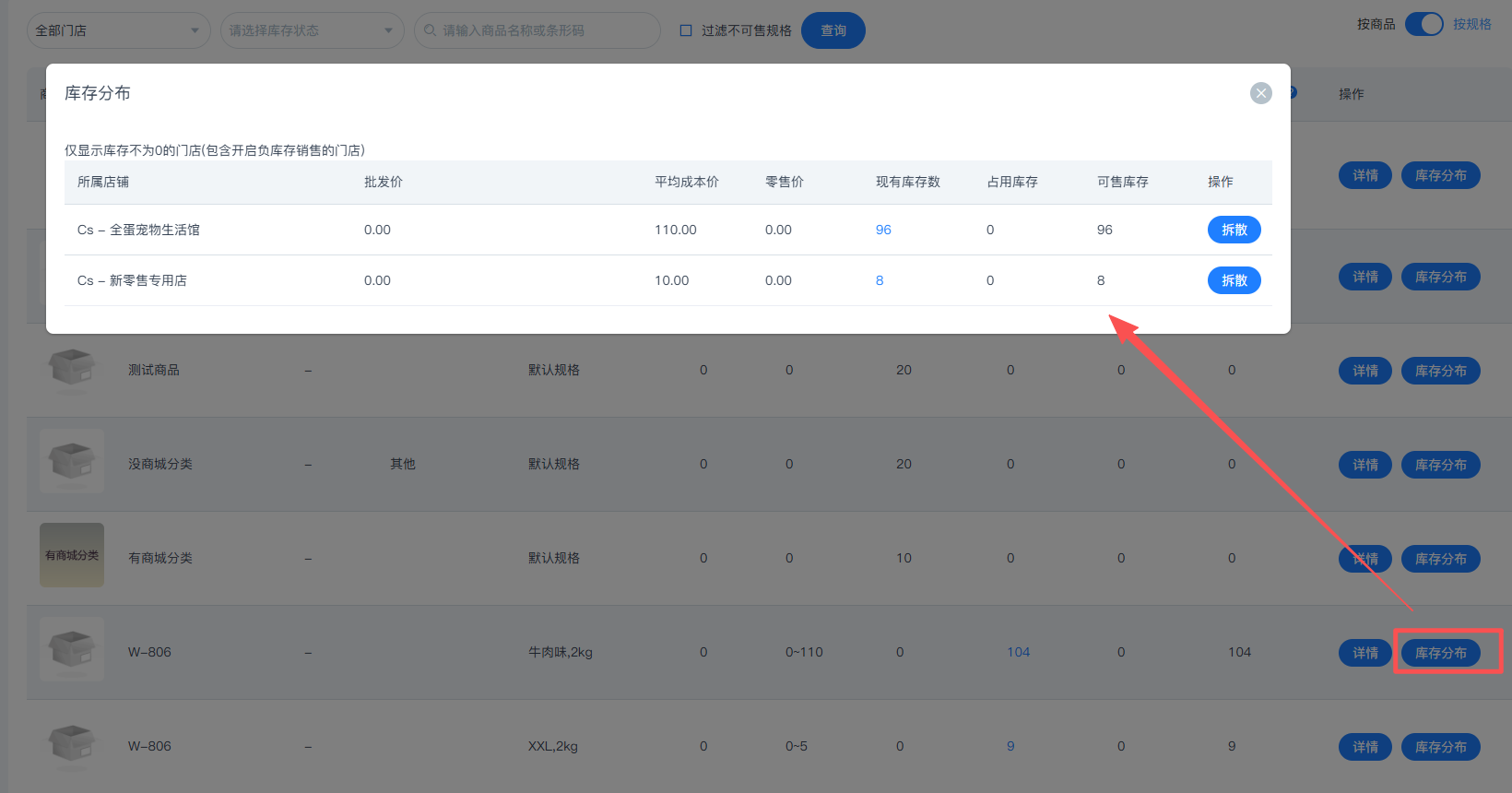 总部支持查看所有分店库存数量,点击【库存分布】可查看该商品在各个门店的库存分布情况