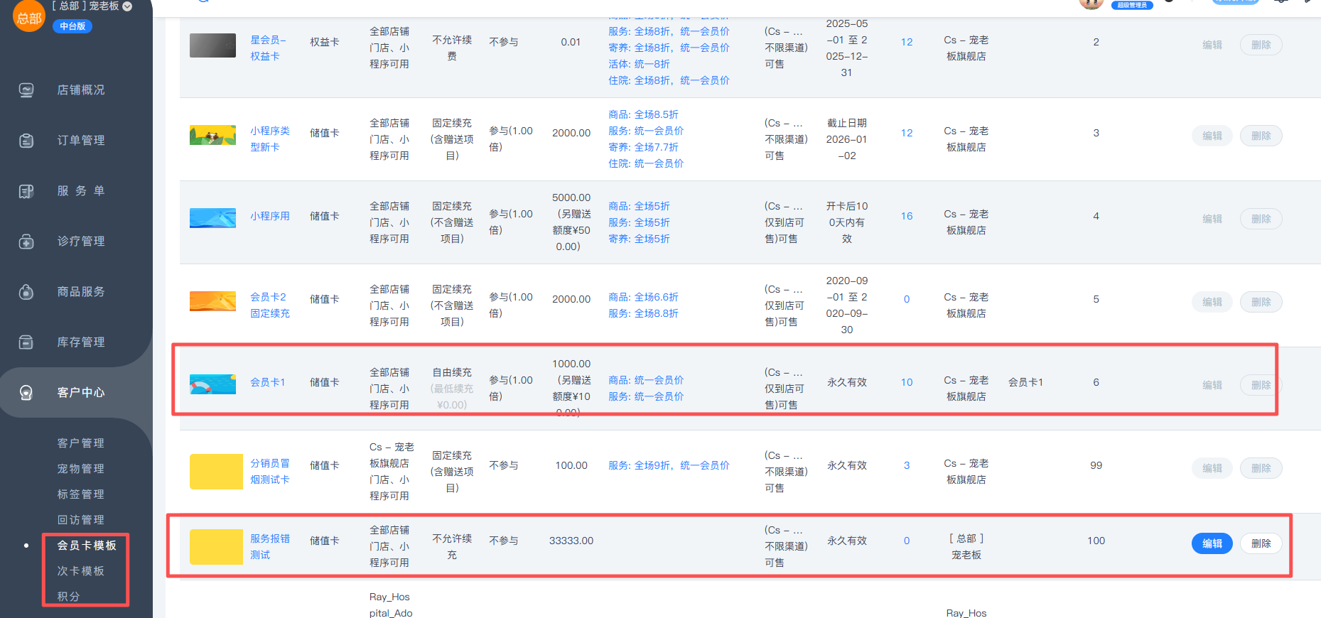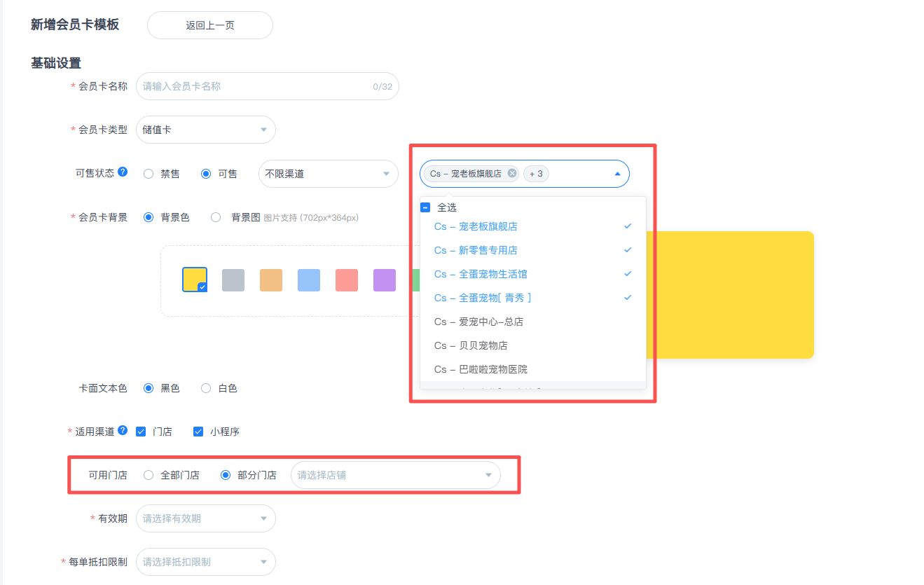 仅总部支持创建跨店会员卡/次卡模板,以及积分活动,分店仅支持创建自己门店的会员卡/次卡模板,且分店创建的模板不支持总部进行编辑