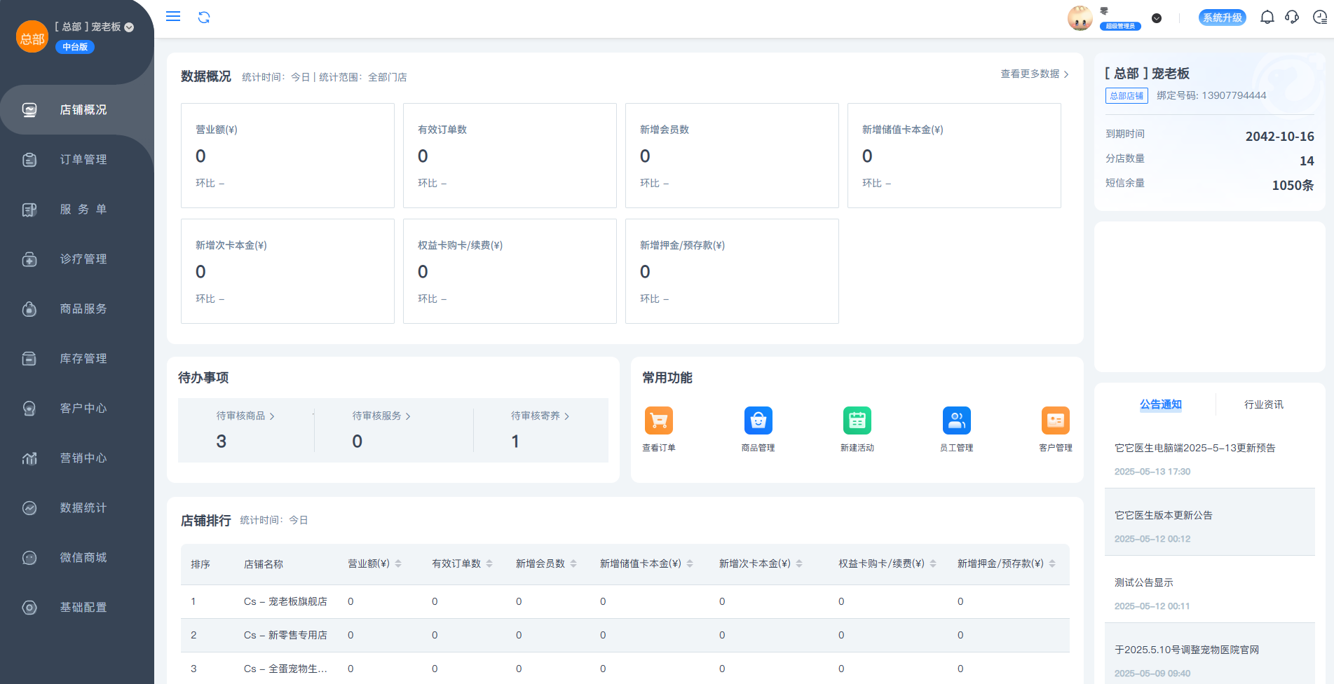 支持查看连锁体系下各门店数据概况及排行,支持快捷跳转常用功能及待办事项
