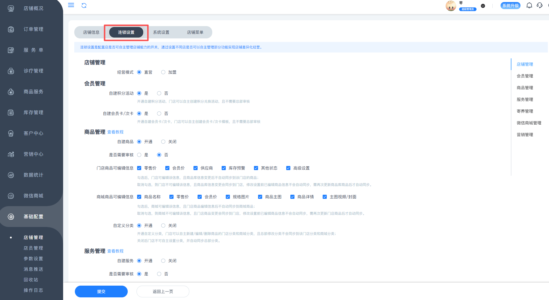 连锁设置是设置各个分店是否有单独管理能力的功能,通过设置不同分店是否可以自主管理部分功能实现店铺差异化经营