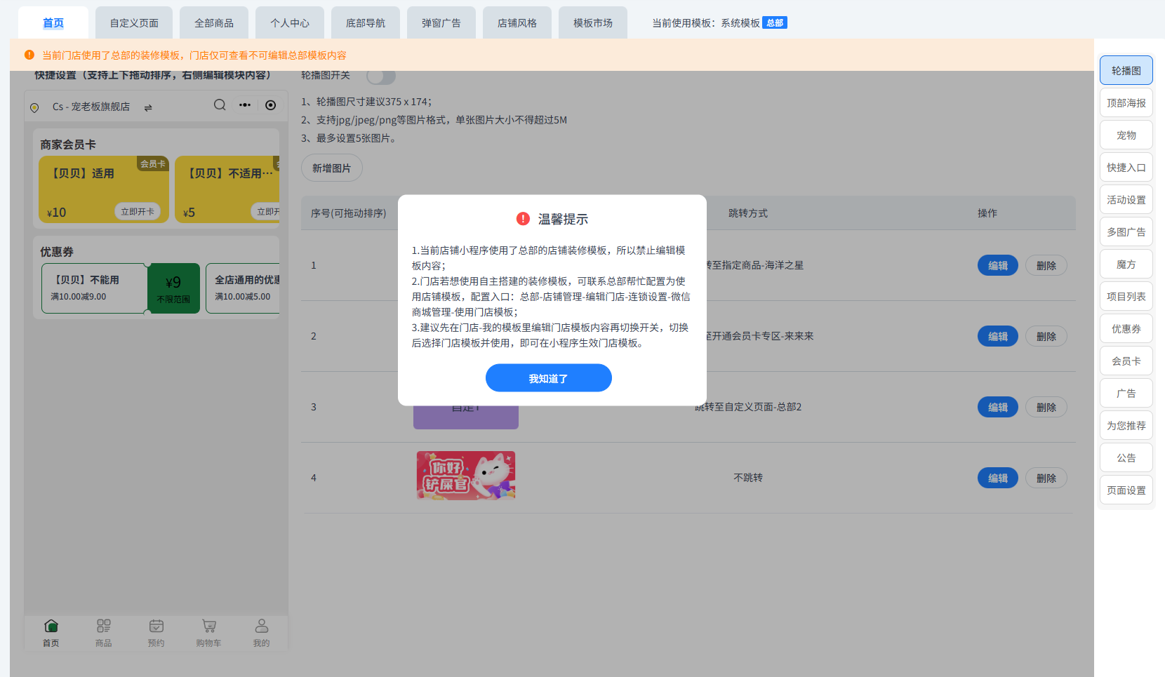 支持总部创建微信商城装修模板,若分店使用总部装修模板则自动同步和使用总部模板作为分店当前使用的小程序装修模板,且不支持编辑