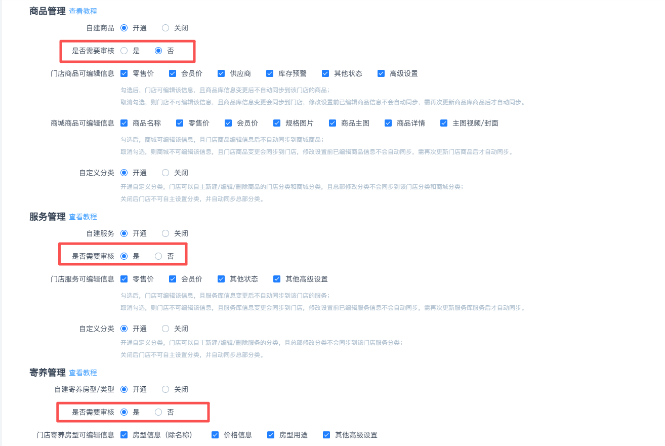 同时支持分店自建的商品服务以及寄养房型是否需要经过总部进行审核,满足对部分分店的差异化管理