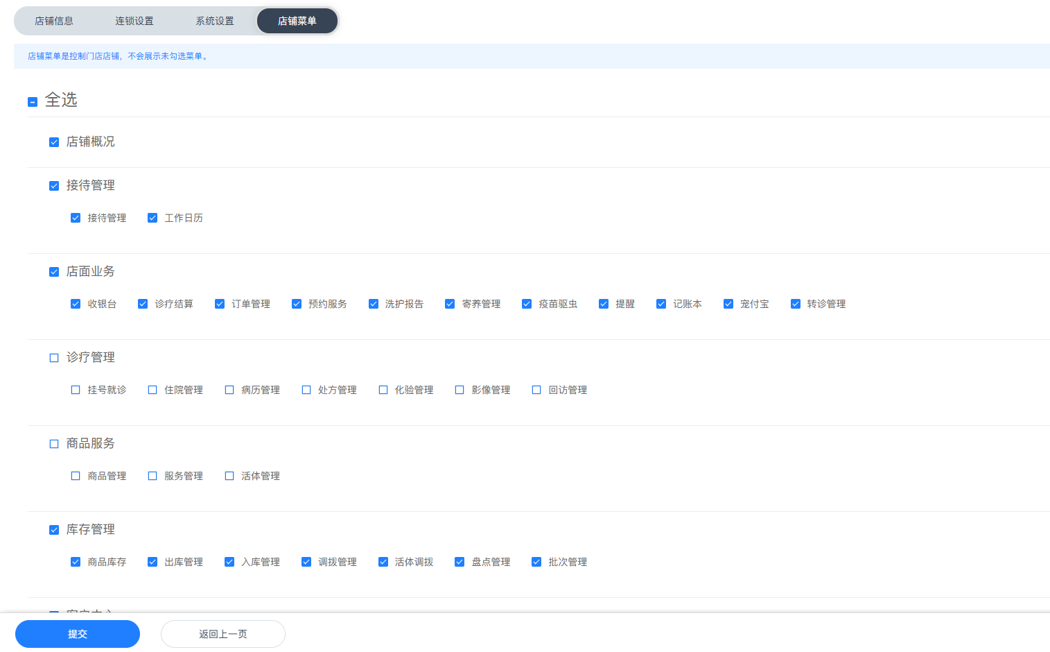 店铺菜单可控制每个分店可以拥有的功能菜单,满足不同职能店铺的差异化设置
