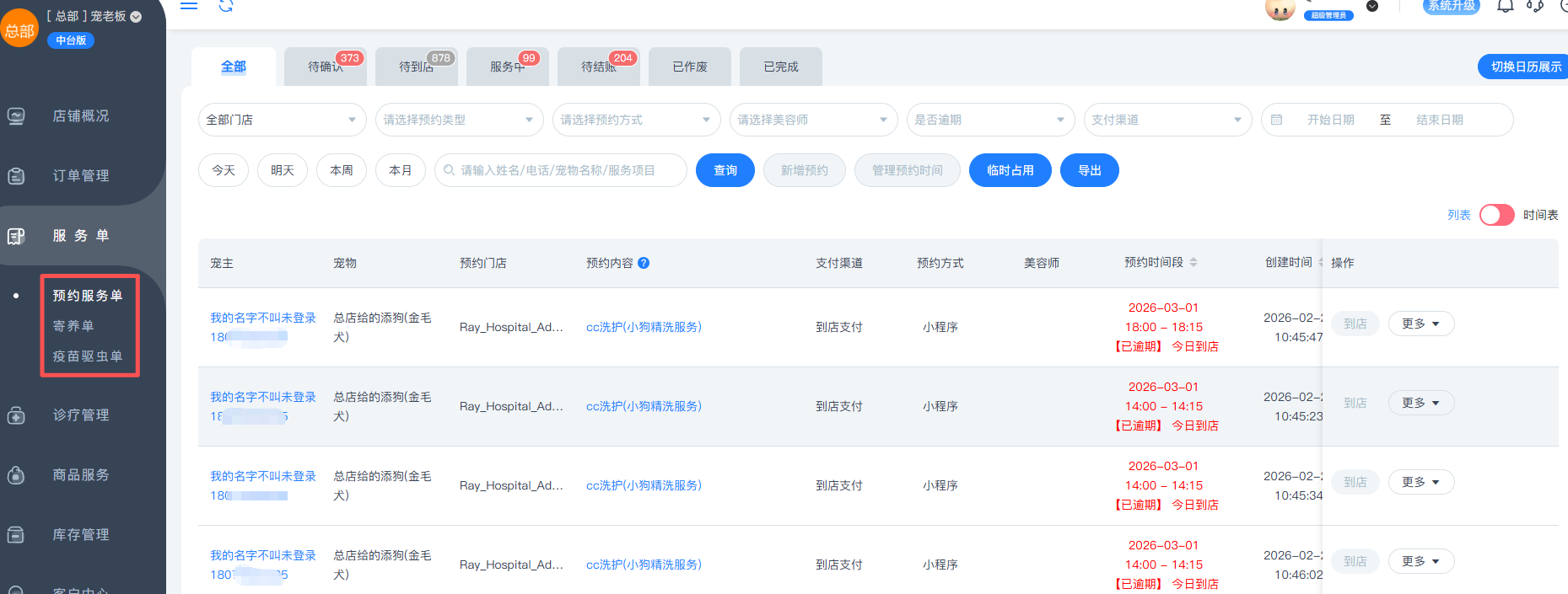 总部整合了所有分店的预约服务订单、寄养订单以及疫苗驱虫订单,方便直接查看分店的服务订单状况