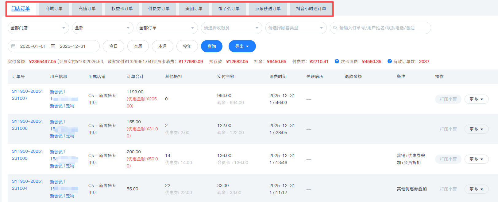 总部整合了包括门店订单、商城订单、充值订单、美团外卖订单等各种订单类型,可直接查看所有分店所有订单,但仅支持筛选查看和导出,不支持其他操作