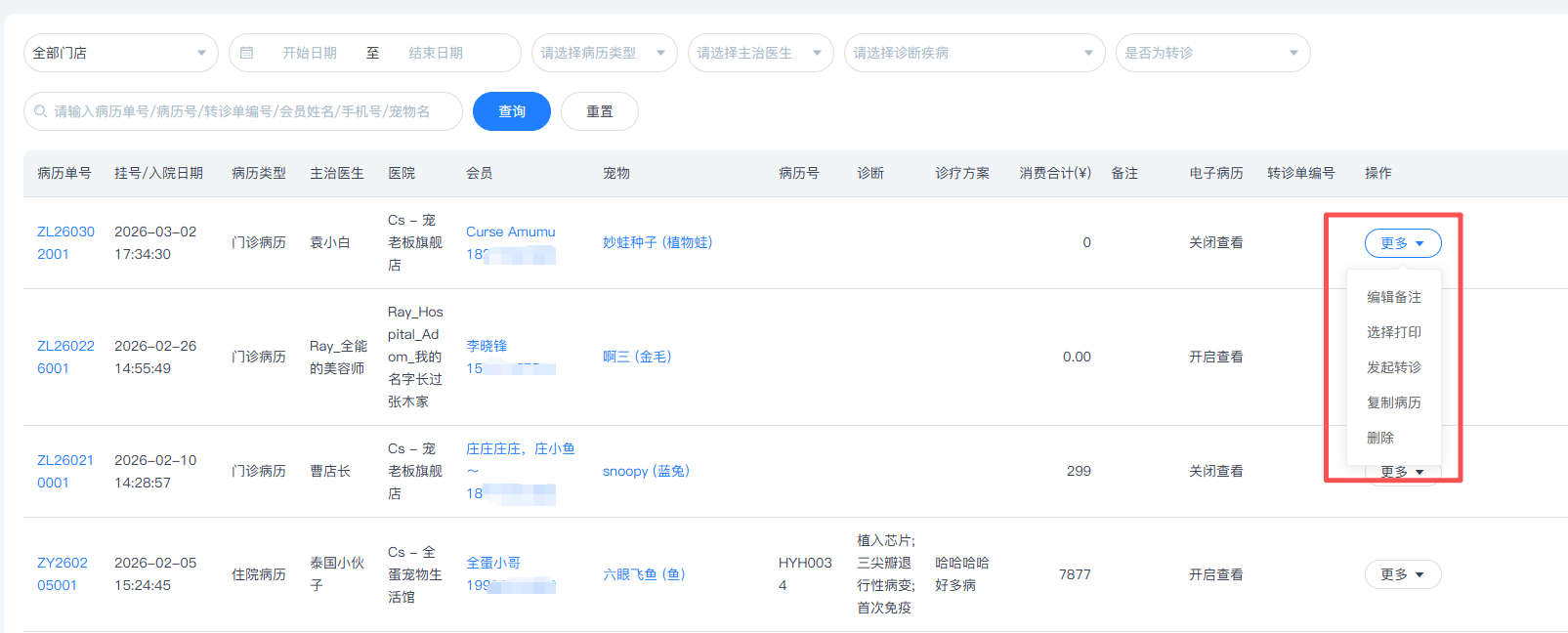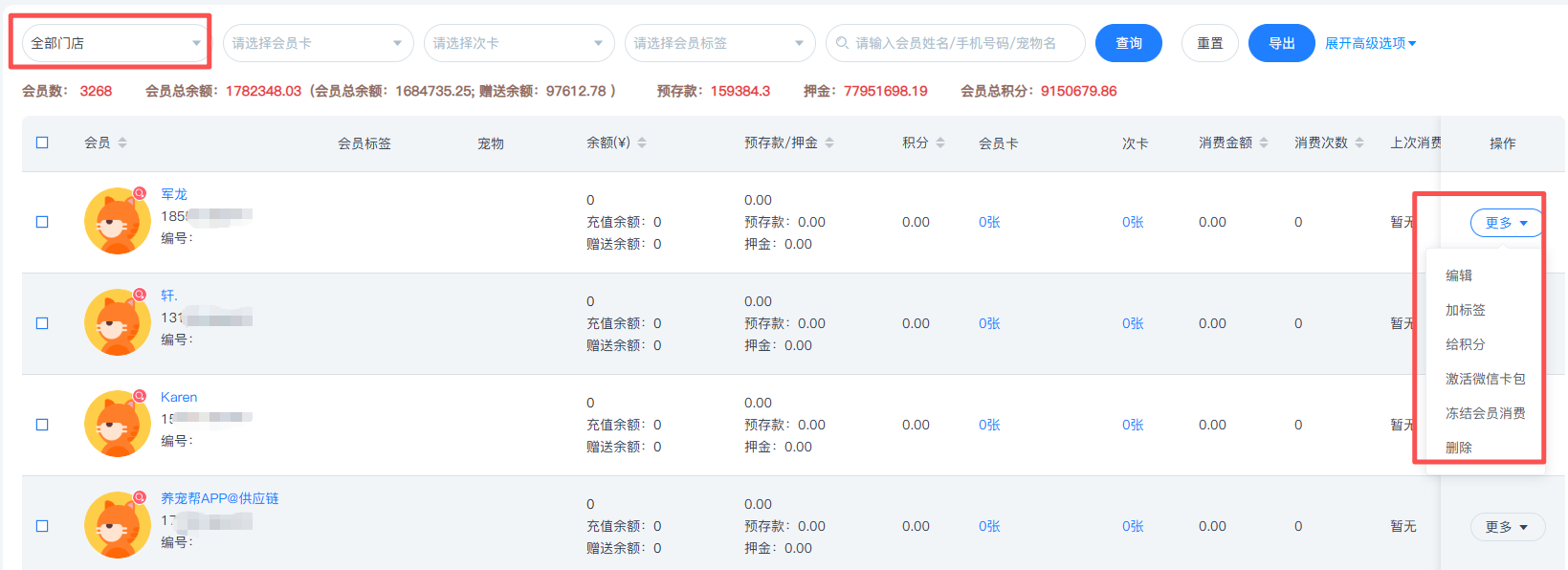 支持总部查看并编辑所有分店的会员信息、宠物信息