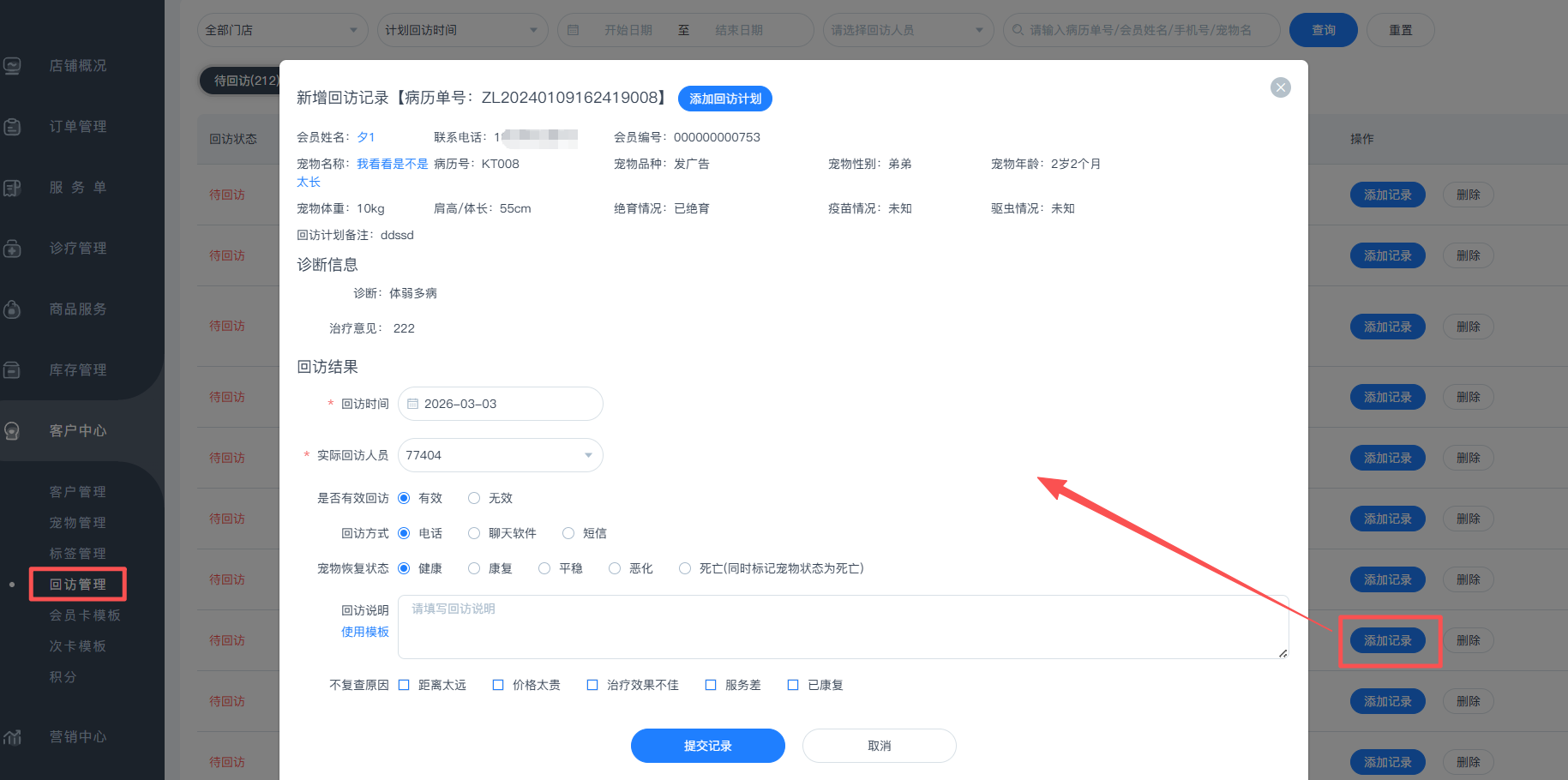 总部支持对分店病历添加回访记录以及回访计划