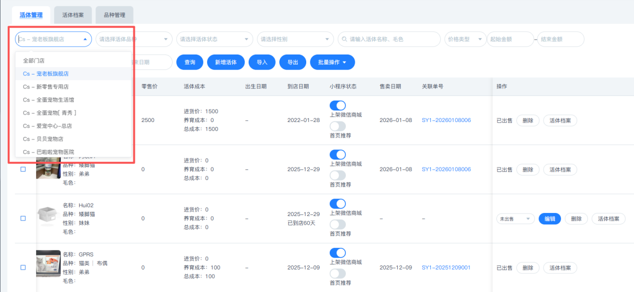 3. 新增支持查看跨店活体,可查看各分店活体数量,方便连锁门店活体调拨