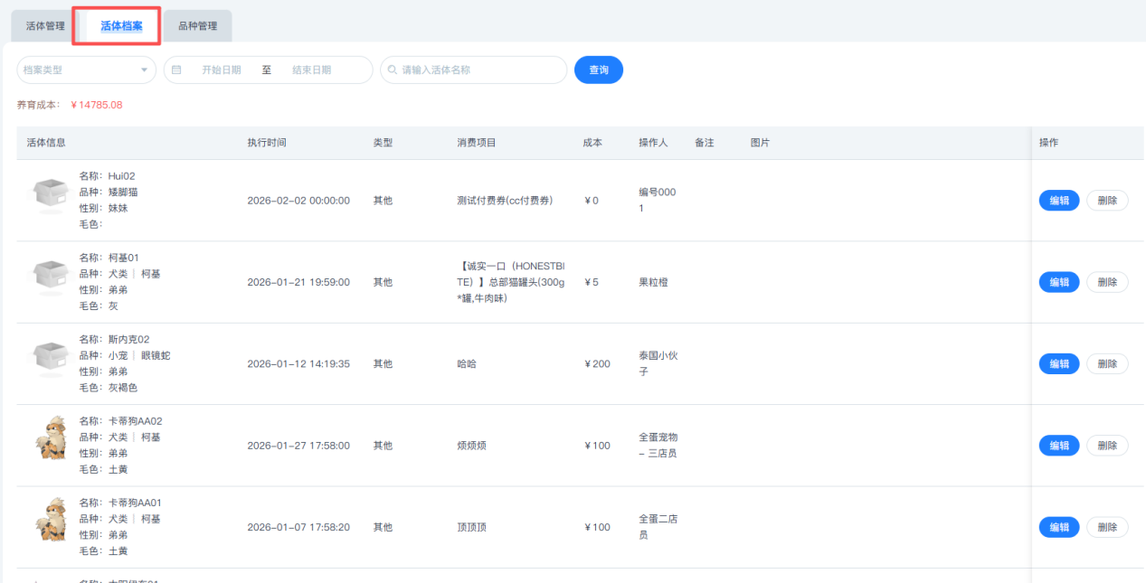 展示当前店铺所有活体的活体档案,支持按档案类型和执行时间筛选查看及编辑