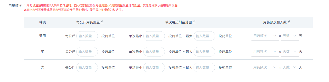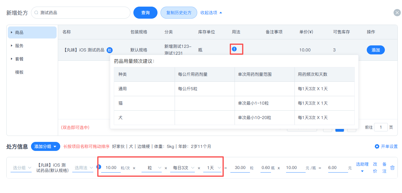 2. 诊疗开处方选择药品时,新增支持展示药品用量频次信息,添加药品后将根据宠物品种和体重、药品的用量和频次,自动算出总用量