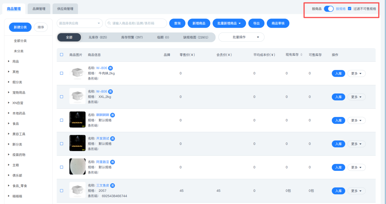 7. 商品列表新增按商品维度/按规格维度展示,并支持过滤不可售规格