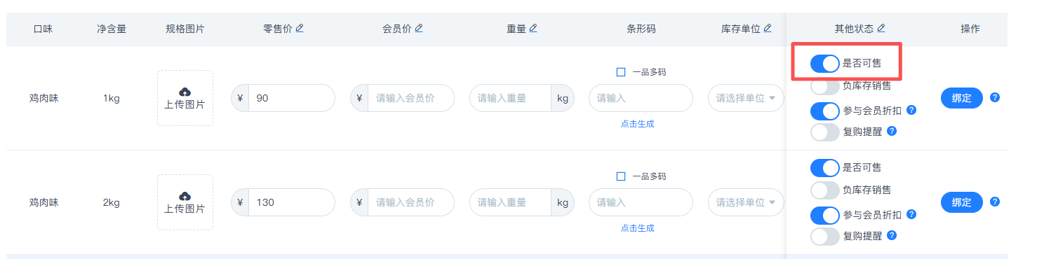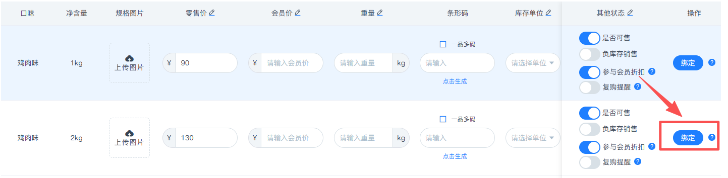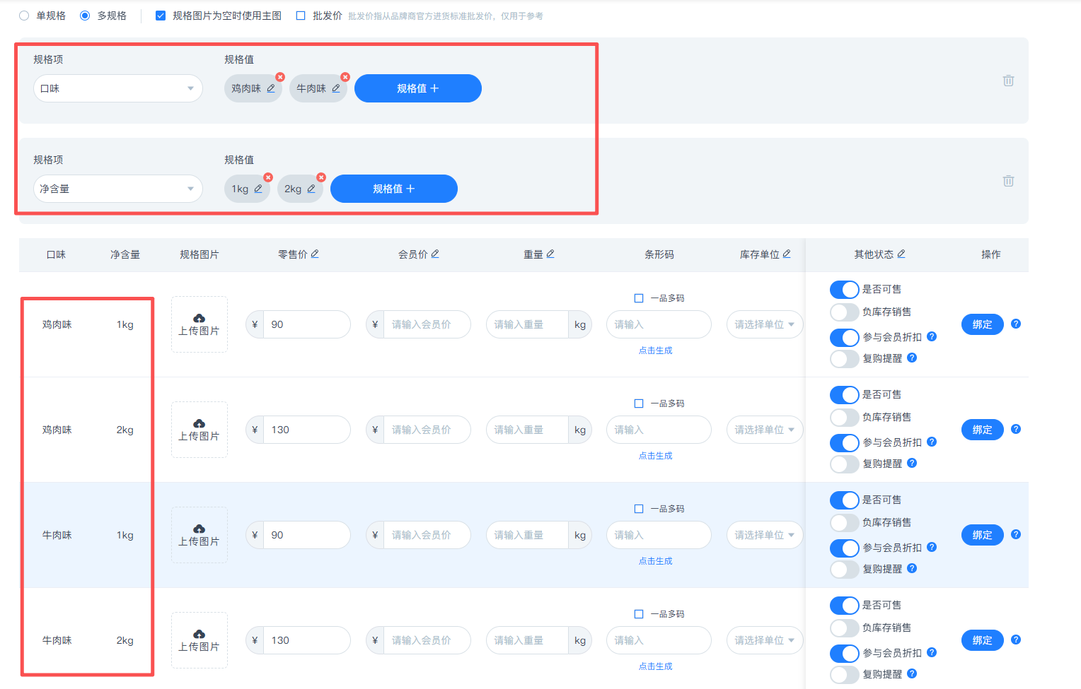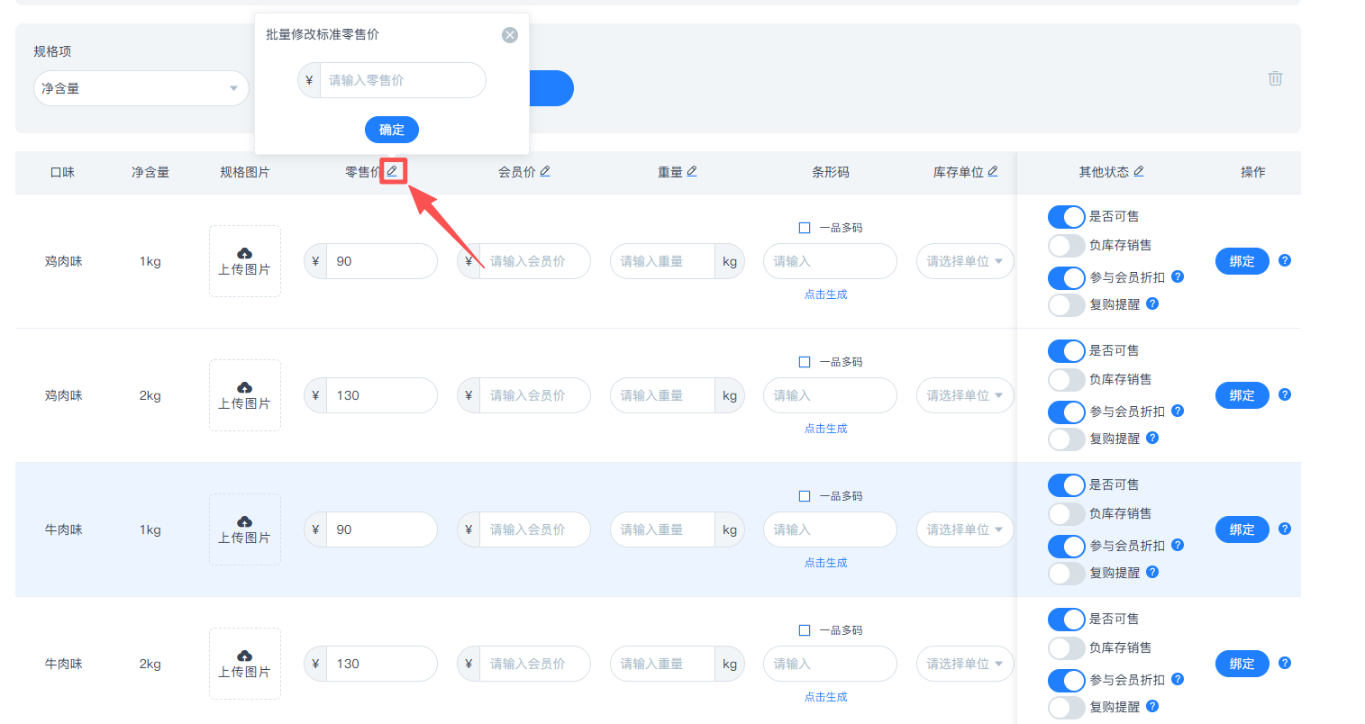 4. 多规格模式下,支持批量设置每个规格的零售价、会员价、重量、库存单位及其他状态
