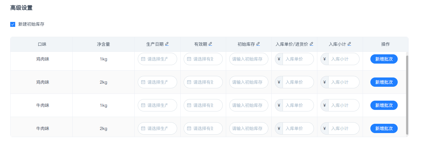 2. 多规格模式下高级设置支持对每一个规格单独录入库存及进货价