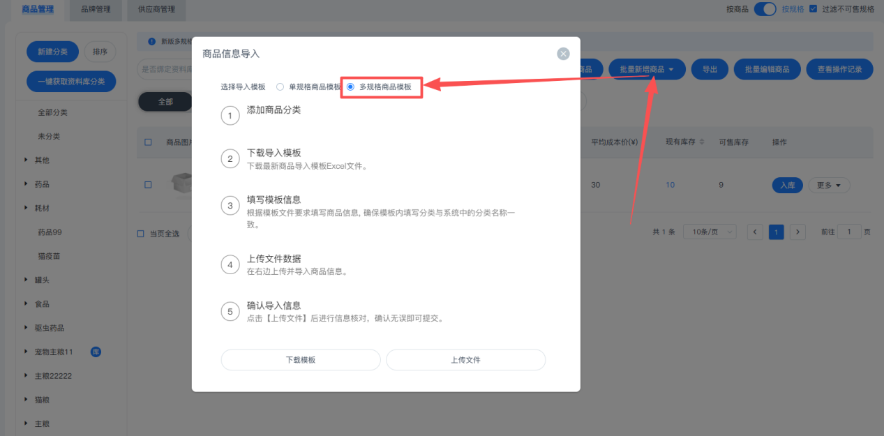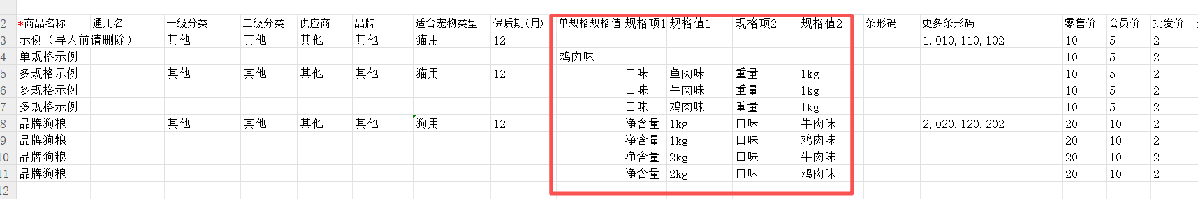 注:导入多规格商品时请严格按照导入规则填写商品信息,否则可能会导入失败,具体导入规则详见最上方具体公告链接
