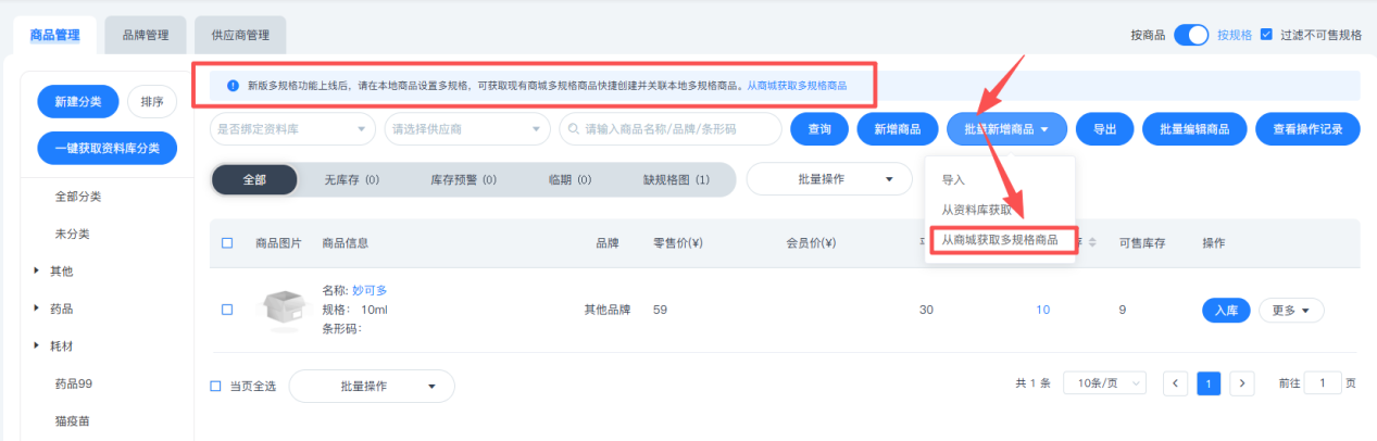 9. 连锁资料库同步新增多规格商品,且规格变更时将同步至本地商品及微信商城商品
